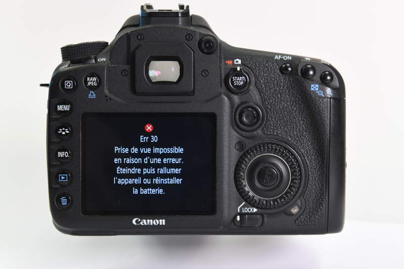 Le message « Err 30 » s'affiche sur l'écran arrière ou supérieur de votre boîtier Canon après le déclenchement. L'appareil refuse de prendre des photos et le message peut apparaître de façon intermittente avant de devenir permanent. Cette erreur concerne le mécanisme d'obturateur et touche aussi bien les boîtiers d'entrée de gamme (Canon 650D, 750D, 1100D) que les modèles semi-professionnels et professionnels (Canon 7D, 5D Mark III, 1DX).