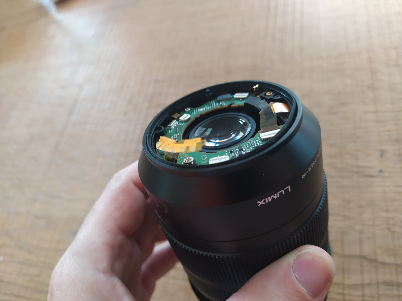 Le remplacement du support de monture nécessite un démontage significatif de l'objectif. Nous commençons par évaluer l'étendue des dégâts : bague seule, pattes internes, nappe flex, et éventuel décentrement optique. La bague bayonnette est remplacée par une pièce neuve (les références H-ES12060 et H-FS12060 utilisent des montures spécifiques non interchangeables). Si les pattes internes sont touchées, nous reconstruisons les points d'ancrage. La nappe flex est remplacée si nécessaire. Après remontage, un contrôle complet du centrage optique et de la qualité d'image est systématiquement effectué, et un réglage est appliqué si le choc a décalé des groupes optiques. L'objectif est testé sur banc pour valider la netteté sur toute la plage focale et la communication électrique avec le boîtier.